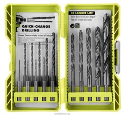 ryobi introduserer 10-delers trespadebitssett. dette settet er perfekt for treboring. spadebitene har et 1/4″ sekskantskaft som er kompatibelt med alle bore- og slagdrivere. Dette settet gir opptil 3 ganger raskere boring, og er utstyrt for alle prosjektene dine trenger. Det inkluderer en oppbevaringsmatte for ekstra organisering av og på arbeidssted. de doble vingesporene på spadebitene gir enkel hulldannelse og forhindrer utbrudd. Dette utvalget er perfekt for alle dine prosjekter, inkludert treoverflater. dette settet er en forbruksartikkel og inkluderer (1) 1/4″ spadebits , (1) 3/8″ spadebit, (1) 1/2″ spadebit, (1) 9/16″ spadebit, (1) 5/8″ spadebit, (1) 11/16″ spadebit , (1) 3/4″ spadebit, (1) 13/16″ spadebit, (1) 7/8″ spadebit og (1) 1″ spadebit.