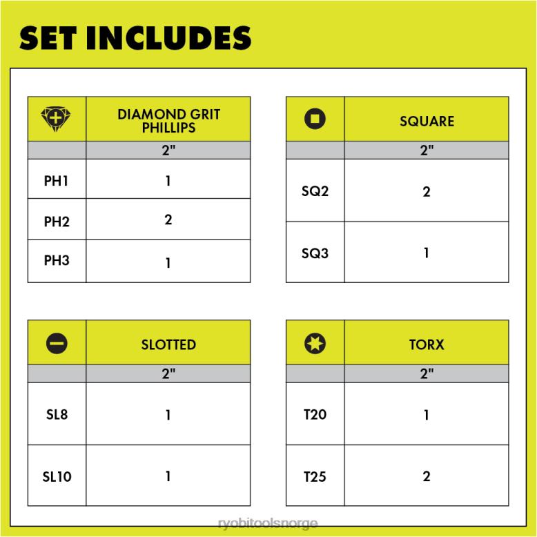komplimenter verktøysamlingen din med ryobi diamantkornbelagt teknologi. disse 12 stk. 2-tommers diamantslagdrivbits inkluderer diamantbelagte slag-phillips-bits og ekstra slagklassifiserte drivbits. Diamantkornbelagt-teknologien gir et ekstra lag med beskyttelse for 20 ganger lengre levetid, og forbedrer bitens holdbarhet på tvers av alle phillips-skrukjøringsapplikasjoner. diamantkorn produserer en 2x sterkere grep som muliggjør et sterkt pre-driving hold og plassering av festet inn i biten. Dette ekstra grepet skaper en lignende opplevelse som en magnetisk ladet bit, men med et sikrere hold. diamantkornbelagt teknologi griper inn i phillips feste under kjøring for bedre montering for å forhindre stripping av stjernehodetsettet hans tilbyr et bredt utvalg av kjøreløsninger som kan håndtere profesjonelle og diyer-behov. disse 12 stk. 2″ slagdrivbits er kompatible med standard bor og slagdrivere og inkluderer (1) 2″ diamant ph1, (2) 2″ diamant ph2, (1) 2″ diamant ph3, (1) t20, (2) t25, ( 1) sl8, (1) sl10 , (2) sq2 og (1) sq3.