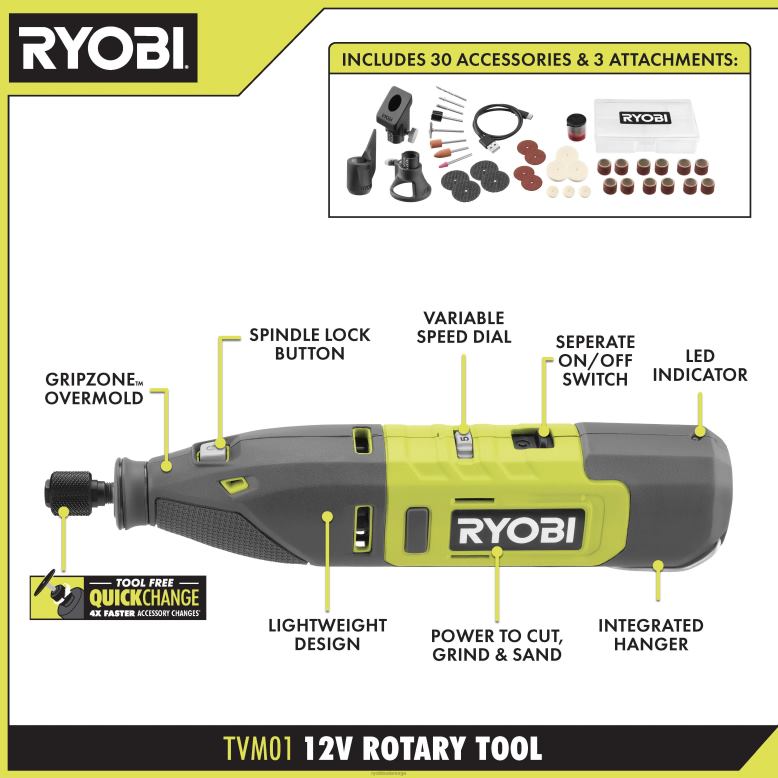 ryobi introduserer 12v trådløst roterende verktøysett. dette 12v roterende verktøyet har en rekkevidde på 5 000 – 35 000 nominelle rpm som gir brukerne muligheten til å kutte slipe og pusse de fleste materialer med letthet. det variable hurtighjulet lar deg finne den perfekte hastigheten for hver applikasjon, og den lette designen gjør det lettere å utføre jobber på trange arbeidsplasser. Dette verktøyet har også den nye innovative hurtigskiftehylsen med 4 ganger raskere tilbehørsbytte, noe som gjør bytte av tilbehør raskt og enkelt. støttet av ryobi 3-års produsentgaranti, inkluderer det 12V trådløse roterende verktøysettet 35 tilbehør, 3 tilbehør, skiftenøkkel, tilbehørsoppbevaringsveske, usb-kabel og brukerhåndbok.