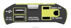 utvid ryobi one+-systemet med 120 watts bilkraftkilde. denne strømkilden bruker 18v one+ batterier eller et kjøretøys 12v likestrømuttak for å gi 120 watt praktisk, bærbar strøm. denne enheten kan drive eller lade flere små elektroniske enheter som mobiltelefoner, nettbrett, bærbare datamaskiner, små vifter og lys. du kan lade telefonen opptil 6 ganger eller kjøre et LED-lys i over 5 timer med bare (1) 18v one+ 4ah batteri. den er ideell for situasjoner som ekstern rekreasjonsbruk, reiser, eksterne arbeidsplasser og arbeidsmiljøer, strømbrudd (for små elektroniske enheter), eller andre tidspunkter du trenger pålitelig strøm eksternt eller mens du er på farten. denne strømkilden har (1) 120 volt vekselstrømsuttak og (2) usb-a-porter. best av alt, det er en del av ryobienone+ system – et hvilket som helst 18v one+ batteri fungerer med alle 18v one+ produkter. denne strømkilden dekkes av en 3-års produsentgaranti og inkluderer ryi120a 120 watt strømkilde, 18v one+ adapter, biladapterledning og brukerhåndbok. batteri og lader selges separat.