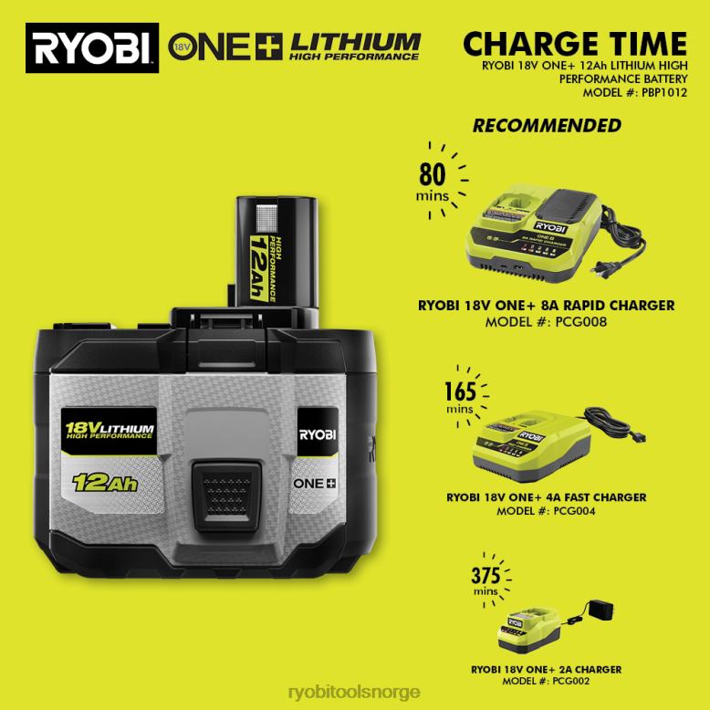 utvid ryobi 18v one+-systemet med 18v one+ 12ah litium høyytelsesbatteri. dette 12ah-batteriet har førsteklasses 21700-celler som, kombinert med vår intellicell-teknologi, leverer opptil 40 % mer kraft og opptil 10 ganger mer kjøretid, noe som øker den totale effektiviteten. med dette batteriet kan du lage over 900 tverrsnitt per lading på 3-1/4” fotlist ved hjelp av vår børsteløse 10” glidende gjæringssag. vårt cool-core pro varmestyringssystem bruker robuste lasersveisede cellestropper og oppgraderte kjøleribber for å redusere temperaturen mens den er i bruk. dette vil optimere ytelsen, slik at batteriet kjører 30 % kjøligere, lever 50 % lenger og leverer strøm uten falming under alle forhold. en ekstra slitesterk overform øker beskyttelsen på og utenfor jobbennettstedet. den robuste designen og antivibrasjonsteknologien øker holdbarheten og forbedrer brukeropplevelsen under krevende applikasjoner. den høysynte ledede drivstoffmåleren viser tydelig gjenværende driftstid. par dette høyytelses litiumbatteriet med et hvilket som helst 18v one+ hk-verktøy for mer kraft, lengre driftstid og den beste opplevelsen totalt sett på 18v one+-systemet. del av ryobi one+-systemet – et hvilket som helst 18v one+-batteri fungerer med alle 18v one+-produkter. dette 18v one+ 12ah litium høyytelsesbatteriet er støttet av ryobi 3-års produsentgaranti og inkluderer (1) pbp10012 18v one+ 12ah litium høyytelsesbatteri og brukerhåndbok. lader selges separat.