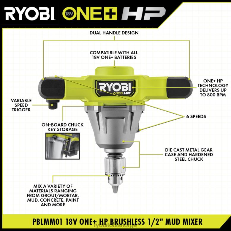 RYOBI 18v one+ hk børsteløs 1/2 mud mixer kit elektroverktøy Z800T191