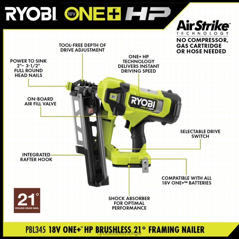 RYOBI 18v one+ hk børsteløs 30 graders airstrike innramming spikersett elektroverktøy Z800T168