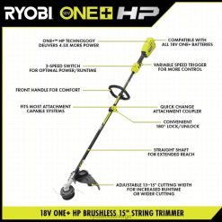 ryobi 18v one+ hp børsteløse 15″ strengtrimmer som kan feste er den beste kombinasjonen av kraft og allsidighet … den har en børsteløs motor for maksimal kraft og holdbarhet. utvidelsesfunksjonen gjør at du kan forvandle trimmeren din til en kantklipper, blåser, stangsag og mange flere verktøy med tilgjengelige tilbehør, noe som betyr at du kan spare tid, plass og penger. denne trimmeren er utstyrt med spole easy+ bump-materhodet med hastighetsviklingssveiv som kan lades om på 60 sekunder eller mindre. den variable hastighetsutløseren og 2-trinnsbryteren gir økt kontroll for alle bruksområder. den justerbare 13″ til 15 ” klippebredde lar deg optimalisere trimmeren for øktkjøretid eller en bredere skjærebredde. denne lette og velbalanserte designen har også et fronthåndtak for komfort, og trimmeren er utstyrt med et 6,0 ah batteri for lengre driftstid. batteriet er kompatibelt med ryobi one+-systemet. støttet av en 3-års garanti.