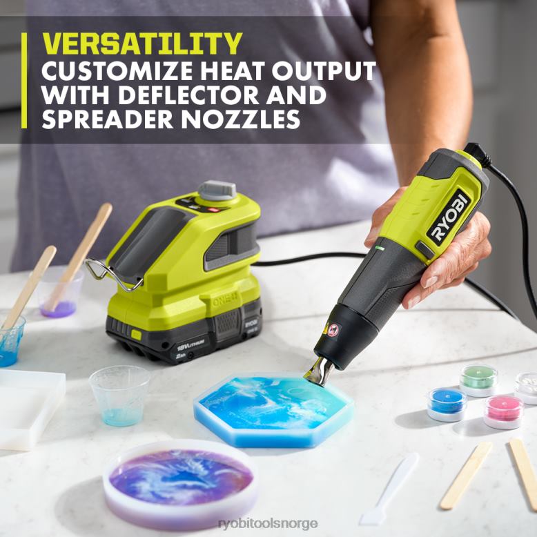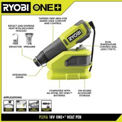utvid ryobi 18v one+-systemet med ryobi 18v one+ varmepenn. det doble temperaturkontrollhjulet fra 450 grader/750 grader f gjør det enkelt å jobbe med varmefølsomt materiale. Denne 18V varmepennens kompakte design er flott for presise bruksområder som limfjerning, malingsfjerning, varmeoverføring, krympeslange og mer. det integrerte stativet gjør det enkelt for håndfri bruk. reflekterer og sprer enkelt varme med deflektor- og sprederdyser som er inkludert i tilbehørsoppbevaringen ombord for ekstra bekvemmelighet. del av ryobi one+-systemet – et hvilket som helst 18v one+-batteri fungerer med alle 18v one+-produkter. denne 18v one+ varmepennen er støttet av ryobi 3-års produsentgaranti og inkluderer pcl916 18v one+ varmepenn, 18v one+ 2ah litiumbatteri, 18v one+ lader, deflektordyse, spreader-dyse og brukerhåndbok.