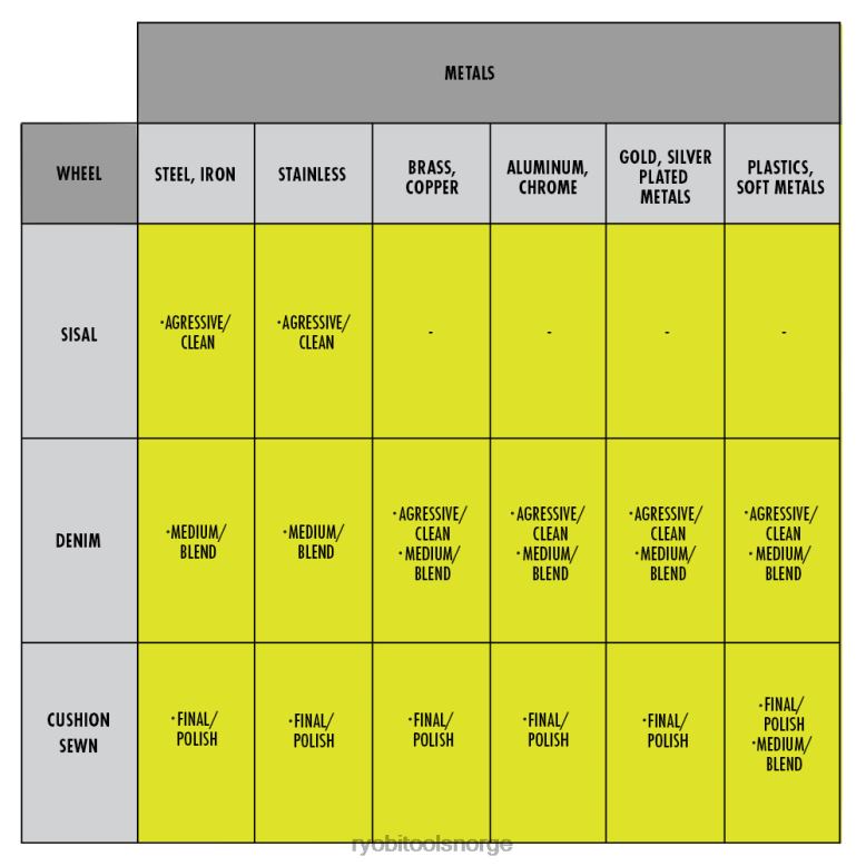 komplimenter verktøysamlingen din med 4 stk. 4″ polerings- og poleringshjulsett. disse poleringshjulene kan brukes i flere stadier av poleringsprosessen og kan brukes på en rekke metaller. disse hjulene er kompatible med benkslipere og boremaskiner med medfølgende dor. for best mulig resultater bruk med ryobi-metallrengjøringsmiddelsettet. dette settet inkluderer (1) sisalhjul, (1) spiralhjul i denim og (1) putesydd hjul og (1) 1/4″ sekskantspindel.