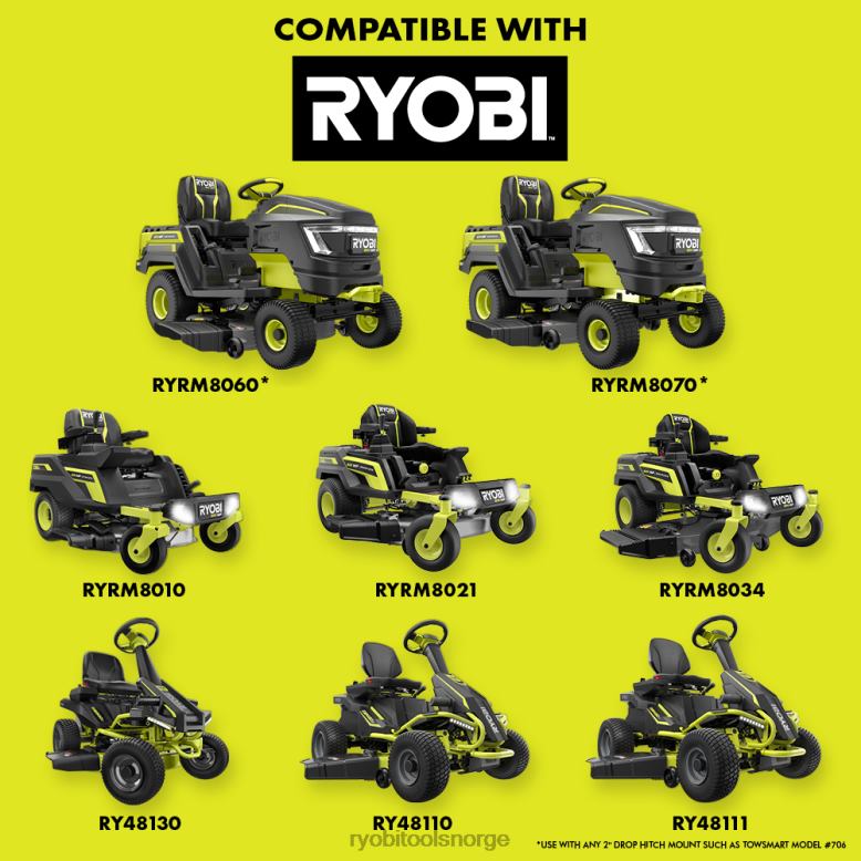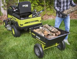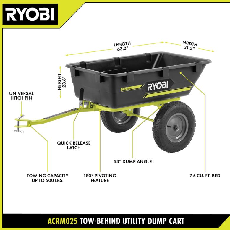 ryobi-tow-behind utility dumper med universalfeste gir allsidig trekking og tauing for daglig bruk. fest denne redskapsdumpervognen til en kjøregressklipper, gressklipper eller gresstraktor for å enkelt frakte last over eiendommen din. med en slepekapasitet på opptil 500 pund og en seng på 7,5 fot^3, kan du enkelt frakte mulch, jord, planter, steiner, ved, hageverktøy og mer. Spar tid med 180-graders svingfunksjonen som lar deg enkelt og presist dumpe til venstre, høyre eller bak den parkerte klipperen. denne dumperen er designet for å håndtere de tøffeste jobbene med en slitesterk stålramme og 16″ luftfylte dekk for terreng. Tøm enkelt dumperen med 180-graders svingbunn, 53 graders tømmevinkel og hurtiglås. den universelle festepinnen passer til de fleste kjøringerklippere, zero-turn klippere og plentraktorer. skreddersy din bruksdumpervogn med de integrerte stavforlengelsessporene som lar deg bygge dine egne sidepaneler og skillevegger. denne trekkvognen med universalfeste inkluderer stålramme, søppelkasse, metallrørforlengelse, metallfeste, aksel, dekk, monteringsutstyr og brukerhåndbok.