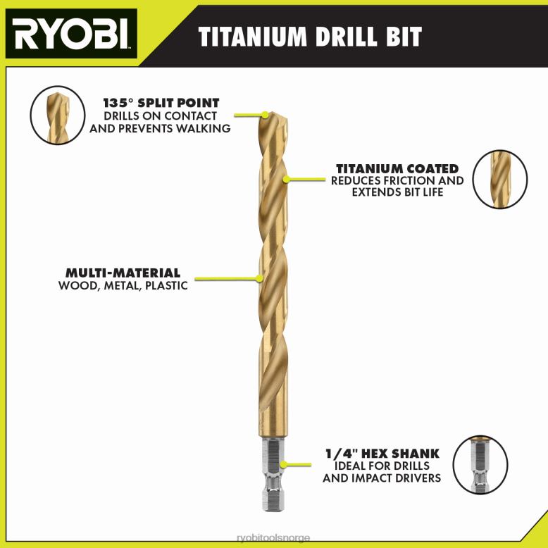 ryobi introduserer titan borkronesettet (22 deler). Ryobi 22-delers titanbelagte borkronesett er et flott tillegg til ethvert verktøysett. bitene varierer i størrelse fra 1/16 tommer til 3/8 tommer, og alle har en 135 graders delt spiss som forhindrer gange. alle bitene har et 1/4 tommers sekskantskaft for enkle bitbytte og kan brukes til å bore tre, metall og plastmateriale. settet inneholder 22 titanbelagte bits fra 1/16 tommer til 3/8 tommer. For flere ting ryobi, besøk ryobitools.com.