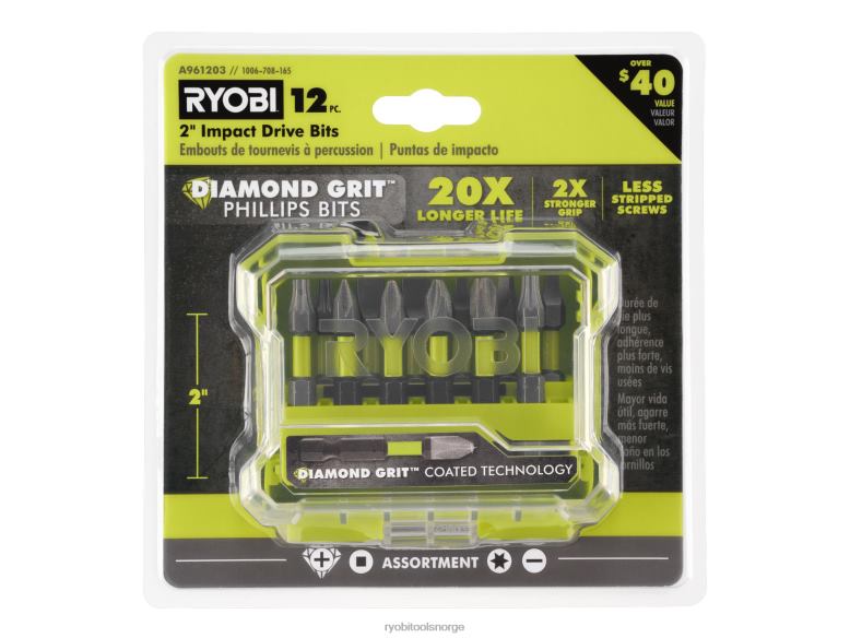 komplimenter verktøysamlingen din med ryobi diamantkornbelagt teknologi. disse 12 stk. 2-tommers diamantslagdrivbits inkluderer diamantbelagte slag-phillips-bits og ekstra slagklassifiserte drivbits. Diamantkornbelagt-teknologien gir et ekstra lag med beskyttelse for 20 ganger lengre levetid, og forbedrer bitens holdbarhet på tvers av alle phillips-skrukjøringsapplikasjoner. diamantkorn produserer en 2x sterkere grep som muliggjør et sterkt pre-driving hold og plassering av festet inn i biten. Dette ekstra grepet skaper en lignende opplevelse som en magnetisk ladet bit, men med et sikrere hold. diamantkornbelagt teknologi griper inn i phillips feste under kjøring for bedre montering for å forhindre stripping av stjernehodetsettet hans tilbyr et bredt utvalg av kjøreløsninger som kan håndtere profesjonelle og diyer-behov. disse 12 stk. 2″ slagdrivbits er kompatible med standard bor og slagdrivere og inkluderer (1) 2″ diamant ph1, (2) 2″ diamant ph2, (1) 2″ diamant ph3, (1) t20, (2) t25, ( 1) sl8, (1) sl10 , (2) sq2 og (1) sq3.