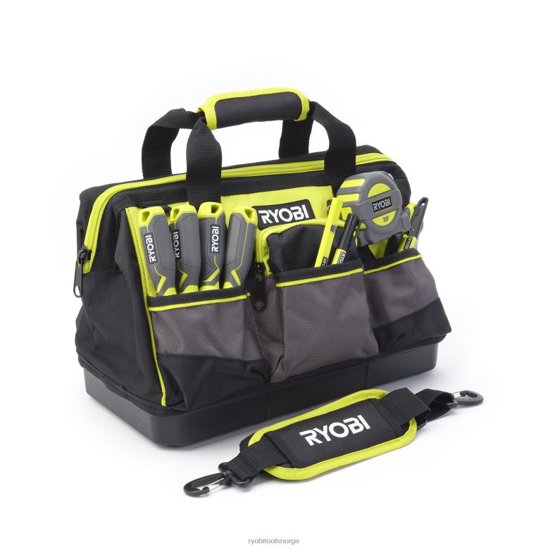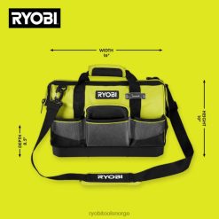 ryobi 16″ verktøyvesken er designet for å tåle de tøffeste arbeidsforholdene med de kraftige 1680d-lommene og vannavstøtende materialet. De 14 lommene, den integrerte målebåndsklipsen og den brede munnåpningen gir enkel tilgang til verktøy for å holde deg organisert mens du er på farten. Den komfortable polstrede skulderremmen og glidelåsen som er lett å lukke gir en sømløs opplevelse mens du beveger deg fra sted til sted.