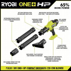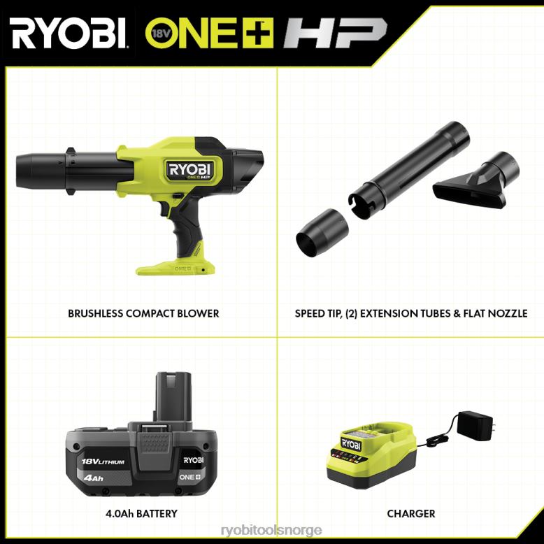 forbedre ditt ryobi 18v one+ system med 18v one+ hp 220 cfm kompakt børsteløst blåsesett. ryobi one+ hp-teknologi kombinerer en kraftig børsteløs motor, avansert elektronikk og høyytelses litiumteknologi for å levere opptil 220 cfm og 140 mph, noe som gjør denne blåseren ideell for å takle harde overflater som garasjer, terrasser og kjøretøy. våre kompakte verktøy er de letteste og minste vi noen gang har laget, samtidig som de leverer optimal kraft for å få jobben gjort. denne blåseren handler om allsidighet. de to forlengelsesrørene kan kombineres for å gi utvidet rekkevidde, og legge opp til ytterligere 20”. den kan også brukes med bare den inkluderte hastighetsspissen for økt mph eller flat dyse for bredere dekning. en del av ryobis kompakte serie, denne blåseren er 45 % mer kompakt enn p2109, og veier mindre enn 4lbs. i sin korteste konfigurasjon er den mindre enn 16 tommer lang, slik at brukerne kan rydde ut trange, vanskelige rom. den variable hastighetsutløseren gir deg maksimal kontroll i ømfintlige områder, og en lås på avtrekkeren gjør det mulig for kontinuerlig bruk uten å holde nede avtrekkeren. det beste av alt er at det er en del av ryobi one+-systemet – et hvilket som helst 18v one+-batteri fungerer med alle 18v one+-produkter. denne 18v one+ hp kompakte børsteløse blåseren og batteriet er støttet av ryobi 3-års produsentgaranti og inkluderer psblb01 18v blåser, pbp005 18v 4ah litiumbatteri, pcg002 18v lader, (2) forlengelsesrør, hastighetsspiss, flat munnstykke, manualer.