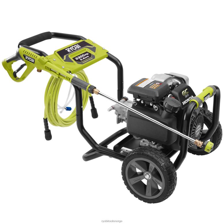 ryobi 3300 psi høytrykkspyler er konstruert for å håndtere de tøffeste jobbene med en kraftig honda gc190-motor og aksialpumpe for å levere 2,4 gpm. den 35 fot høytrykksslangen som ikke skader gir 40 % lengre og 5-i-1 hurtigutskiftningsmunnstykket lar deg raskt endre sprøytemønster for å passe dine rengjøringsbehov best. trillebårens rammedesign og store 10 tommers flate hjul gir økt holdbarhet og det vendbare håndtaket er ideelt for kompakt oppbevaring når jobben er gjort. ryobi 3300 psi høytrykkspyler dekkes av en 3-års begrenset garanti og en 2-års motorgaranti.
