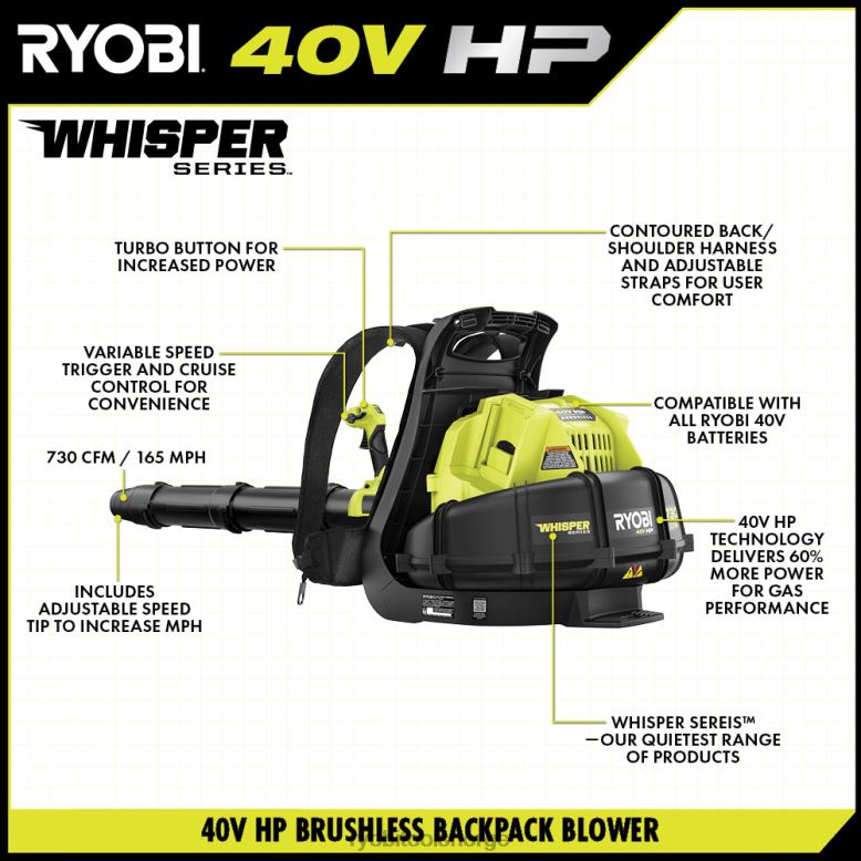 forbedre 40v-systemet med 40v hk trådløs ryggsekkblåsersett. ved hjelp av 40v hk-teknologi, leverer denne ryggsekkblåseren mer kraft enn en 51cc gassblåser, noe som gjør den til en ekte gasserstatning. hp ryggsekkblåseren leverer opptil 52 minutters kjøretid med de inkluderte (2) 40v 6ah litiumbatteriene. 40v hk-teknologi kombinerer en børsteløs motor, avansert elektronikk og høyytelses litiumteknologi, for enkelt å takle våte løv og tyngre plenavfall med 730 cfm og 165 mph. det er gassytelse med bare et trykk på en avtrekker. ingen gass, ingen vedlikehold, ingen problemer. Designet med støydempende skum, er denne blåseren i whisper-serien konstruert for å være 85 % stillere enn gass og til og med andre trådløse blåsere, slik at du kan jobbe når som helst uten å forstyrreg andre. en variabel hastighetsutløser og turboknapp lar deg kontrollere utgangen av luft slik at du kan slå tilbake når du er i ømfintlige områder som å blåse løv fra mulchbed og aktivere turboknappen når du fjerner tøffere rusk. legg til den tilpassbare hastighetsspissen for økt lufthastighet. best av alt er det en del av ryobi 40v-systemet der et hvilket som helst 40v-batteri fungerer med ethvert 40v-produkt. dette 40v hk blåsesettet er støttet av ryobi 5-års produsentens garanti og 3-års produsentens batterigaranti. dette settet inkluderer ry404017 40v ryggsekkblåser, (2) op40605 40v 6ah batterier, op406 40v hurtiglader, blåserør, hastighetstip og brukermanualer.