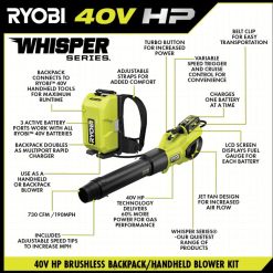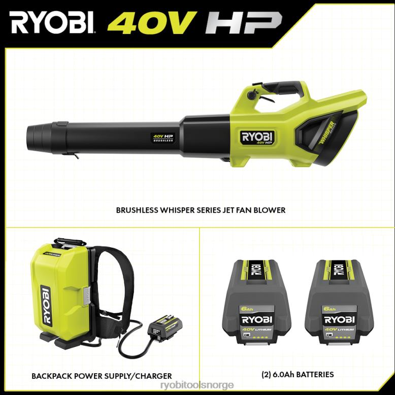 forbedre 40v-systemet ditt med 40v hk trådløs jetvifteblåsesett. ved hjelp av 40v hk-teknologi og jetviftedesign, leverer denne blåseren mer kraft enn en 27cc gassblåser, noe som gjør den til en ekte gasserstatning. denne blåseren går i opptil 30 minutter når den er sammenkoblet med (2) inkluderte 40v 6ah litiumbatterier. 40v hk-teknologi kombinerer en børsteløs motor, avansert elektronikk og høyytelses litiumteknologi for å levere 730 cfm og 190 mph, noe som gjør den ideell for å takle tøffe jobber som våte løv og tungt plenavfall. whisper-seriens blåser er konstruert for å være 86 % stillere enn gass, og enda mer stillegående enn andre trådløse blåsere, slik at du kan jobbe når som helst uten å forstyrre andre. opplev gassytelse med bare et trykk på en avtrekker. ingen gass, ingen vedlikehold og ingen problemer. den variable hastighetsutløseren og turboknappen gir deg full kontroll over luftutslippet, slik at du kan ringe tilbake når du er i ømfintlige områder og aktivere turboknappen for å fjerne tøffere rusk. med to tilpassbare hastighetstips for økt lufthastighet og kompatibilitet med annet tilbehør, gir denne blåseren den ultimate allsidigheten for dine landskapsbehov. best av alt er det en del av ryobi 40v-systemet der et hvilket som helst 40v-batteri fungerer med ethvert 40v-produkt. dette 40v hk blåsesettet er støttet av ryobi 5-års produsentens garanti og 3-års produsentens batterigaranti. dette settet inkluderer ry404010 40v jetvifteblåser, (2) op40605 40v 6ah litiumbatterier, op40bpa 40v integrert lader, blåserør, (2) hastighetstips og brukermanualer.