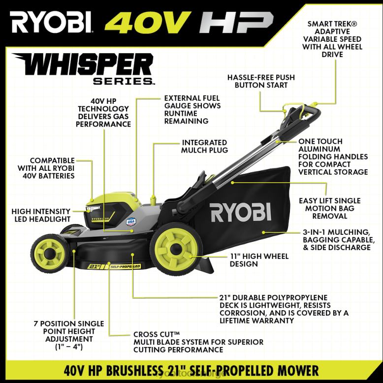 introduserer ryobi 40v hk børsteløs 21” awd gressklipper. 40v hk-teknologi gir mer kraft enn en 170cc gassklipper, noe som gjør denne klipperen til en ekte gasserstatning. den er ideell for opptil hektar med doble aktive batteriporter og går i opptil 70 minutter med de inkluderte (2) 40v 6ah-batteriene. denne klipperen har det tverrskårne flerbladssystemet som gir et overlegent kutt med finere klipp som eliminerer klumping, gir mulighet for ytterligere og jevnere spredning ved sideutkast, og poser mer effektivt enn konkurrentene, slik at du ikke trenger å slutte å klippe for å tøm posen like ofte. den børsteløse motoren og avansert elektronikk reagerer automatisk på klippeforhold ved å øke knivhastigheten for å eliminere fastlåsing og kraft gjennom de tøffeste klippene. som en del av hviskeserien,denne klipperen er 85 % roligere enn gass, og enda mer stillegående enn andre trådløse klippere, slik at du kan klippe når som helst på døgnet uten å forstyrre andre. firehjulsdriftssystemet gir deg ultimat manøvrerbarhet og kontroll i ethvert terreng ved å gi full kraft til alle fire hjulene, mens smart trek selvgående teknologi lar deg enkelt tilpasse klipperens hastighet til ditt tempo med mindre tretthet. velg raskt den perfekte høyden for plenen din, fra 1 tommer til 4 tommer med 7-posisjons enkeltpunkts høydejustering. når jobben er gjort, lar den enkle løftesekken fjernes deg raskt å tømme gressposen uten å søle gressklipp, og de sammenleggbare håndtakene med ett trykk faller raskt og enkelt sammen for kompakt, vertikal oppbevaring selv på trange steder. referer til den innebygde drivstoffmåleren for gjenværende driftstid, og med den medfølgende 40v hurtigladeren lades batteriene opp på mindre enn 60 minutter. bytt raskt fra bagging til mulching ved ganske enkelt å trekke i en spak med integrert mulch plugg. den 11” høye hjuldesignen lar deg svinge lettere og gir bedre generell trekkraft og manøvrerbarhet. det 21” slitesterke komposittdekket er lett, motstår korrosjon og dekkes av en begrenset livstidsgaranti. denne klipperen har høyintensitets LED-frontlykter som lar deg klippe ved daggry eller skumring. best av alt er det en del av 40v-systemet – et hvilket som helst 40v-batteri fungerer med alle 40v-produkter. denne 40v hk børsteløse 21” awd gressklipperen dekkes av 5-års produsentens verktøygaranti og 3-års produsents batterigaranti. den inkluderer ry401201 40v hk børsteløs 21” awd gressklipper, (2) op40605 40v 6ah litiumbatterier, op406 40v hurtiglader, gressoppsamlerpose, startnøkkel, sideutkastssjakt og brukermanualer.
