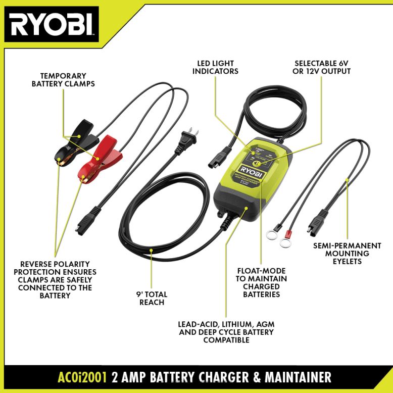 ryobi 2 amp batteriladeren og vedlikeholderen holder det motoriserte kjøretøyets batteri på et toppladenivå, slik at batteriet kan sitte stille uten å bekymre deg for at det er dødt eller skadet når du trenger det den. den er ideell for bruk på alle kjøretøy du ikke bruker daglig, for eksempel fritidskjøretøyer, motorsykler og båter. For bruk over lengre perioder har vedlikeholderen en flytemodusfunksjon som lader batteriet til optimale nivåer, automatisk pauser ladingen for å overvåke batterinivåene og gjenopptar ladingen bare når batteriet trenger en ekstra lading. dette beskytter batteriet slik at du aldri vil bekymre deg for over- eller underlading. velg mellom semi-permanente monteringsøyer eller bruk batteriklemmene for raskt og enkelt oppsett. den er kompatibel med blysyre, lithium, agm og deep cycle 6v og 12v batterier, bytter enkelt fra 6v til 12v med et trykk på en knapp. LED-indikatorlysene viser batteristatus, varsler om omvendt polaritet og informerer deg om du har et defekt batteri. Beskyttelse mot omvendt polaritet sikrer at klemmene er riktig koblet til batteriet, og sikrer sikker bruk. for ekstra bekvemmelighet har denne batteriladeren og vedlikeholderen en total ledningsrekkevidde på 9′. 2 amp batteriladeren og vedlikeholderen er støttet av ryobi 3-års produsentgaranti og inkluderer 6v/12v 2a batterilader og vedlikeholder, batteriklemmer, semi-permanente monteringsøyer og en brukerhåndbok.