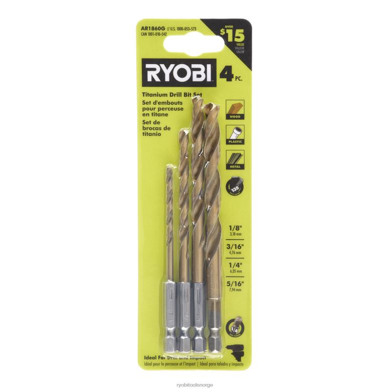 ryobi speed load plus 4-delt sekskantet titan borkronesett er for bruk med boring i tre, plast og metall. settet inkluderer titan høyhastighets stålbor i størrelser på 1/8 tommer, 3/16 tommer, 1/4 tommer og 5/16 tommer. titanbelegget reduserer friksjon og øker borehastigheten i metallboreapplikasjoner.