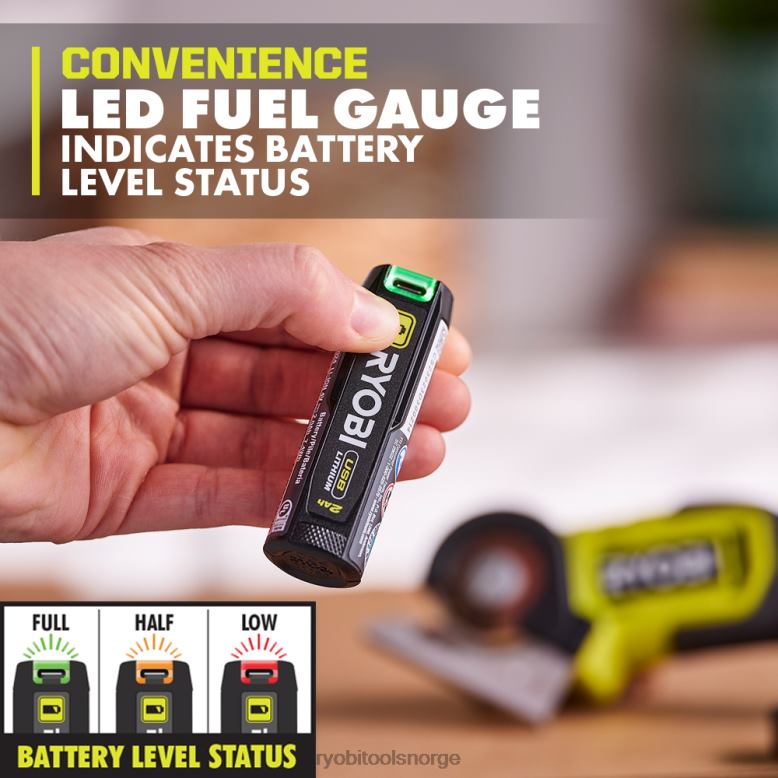 ryobi introduserer usb litium 2ah litium oppladbare batterier. Dette batteriet gir bekvemmelighet mens du er på farten, og vil lade de små bærbare enhetene dine som telefonen eller smartklokken. den innebygde ledede drivstoffmåleren tar bort gjettearbeidet ved å tydelig indikere batterinivåstatusen. dette batteriet har en usb-c-ladeport for enkel lading med en hvilken som helst usb-c-kabel. dette batteriet kan enkelt byttes ut på tvers av alle usb-litiumprodukter for trådløs portabilitet og minimal nedetid. de oppladbare usb litium 2ah litiumbatteriene dekkes av ryobi 2-års produsentgaranti og inkluderer (2) fvb02 usb lithium 2ah oppladbare litiumbatterier og brukerhåndbok.